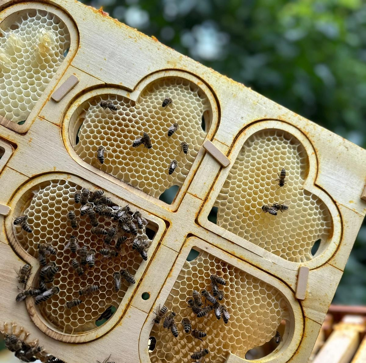 Each wooden heart becomes a natural honey jar — filled, sealed, and shaped by the bees themselves. When the honeycomb heart is capped, it’s ready to be taken out as a perfect solid piece, glistening with pure honey inside. No mess, no spinning, no filtering. Just lift, admire, and share. It’s a stunning piece of nature’s design, and customers absolutely love the story behind it.